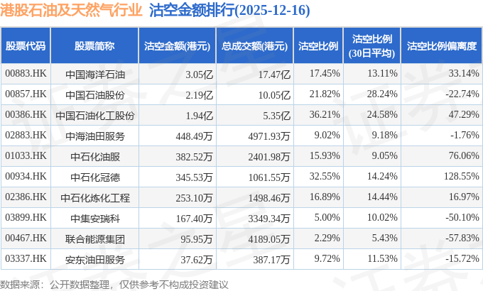 从沽空金额来看,中国海洋石油、中国石油股份、中国石油化工股份沽空金额位居行业前三,分别为3.05亿港元、2.19亿港元、1.94亿港元。