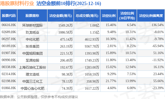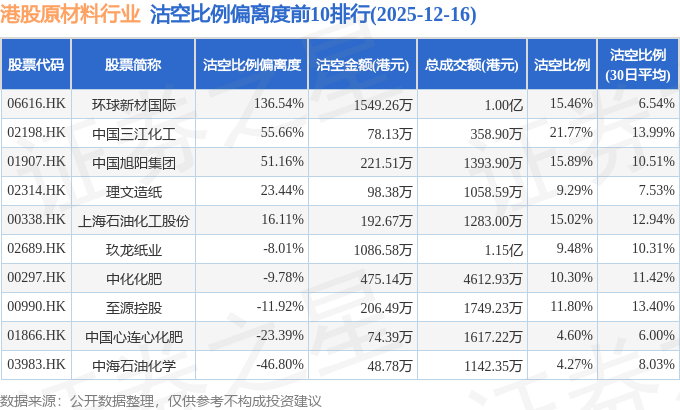 从沽空比例偏离度来看,环球新材国际、中国三江化工、中国旭阳集团沽空比例偏离度位居行业前三,分别为136.54%、55.66%、51.16%。
