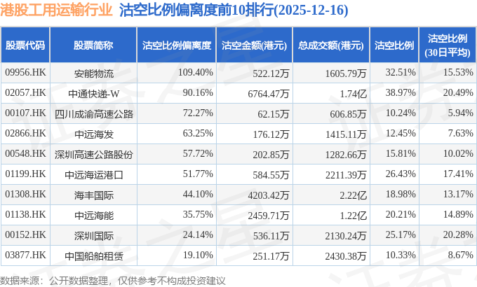 从沽空比例来看,中通快递-W、安能物流、中远海运港口沽空比例位居行业前三,分别为38.97%、32.51%、26.43%。