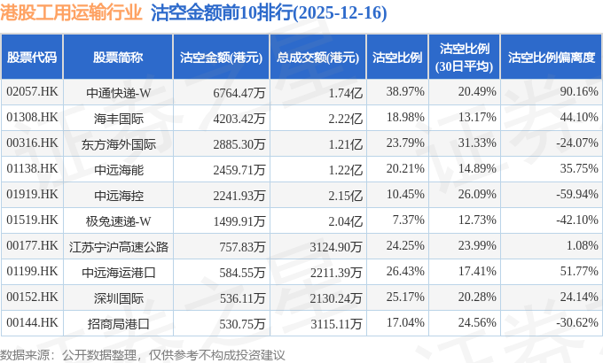从沽空金额来看,中通快递-W、海丰国际、东方海外国际沽空金额位居行业前三,分别为6764.47万港元、4203.42万港元、2885.3万港元。