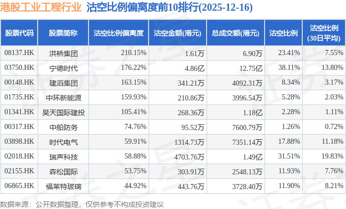 从沽空比例偏离度来看,洪桥集团、宁德时代、建滔集团沽空比例偏离度位居行业前三,分别为210.15%、176.22%、163.15%。