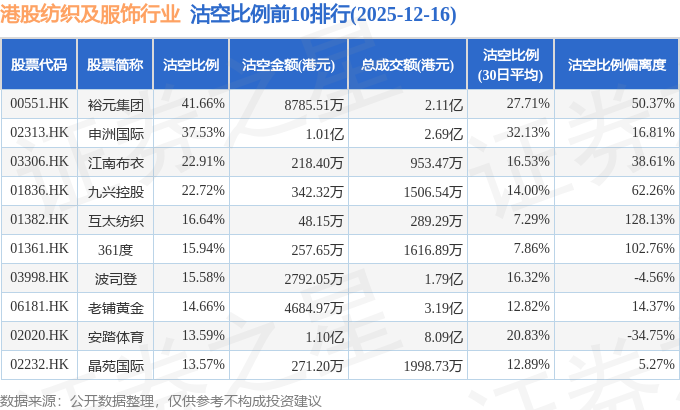 从沽空比例来看,裕元集团、申洲国际、江南布衣沽空比例位居行业前三,分别为41.66%、37.53%、22.91%。