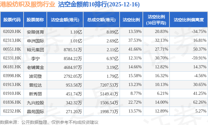 从沽空金额来看,安踏体育、申洲国际、裕元集团沽空金额位居行业前三,分别为1.1亿港元、1.01亿港元、8785.51万港元。