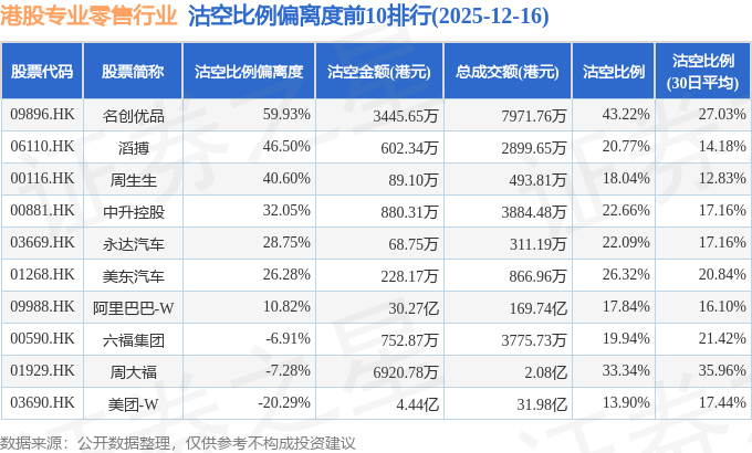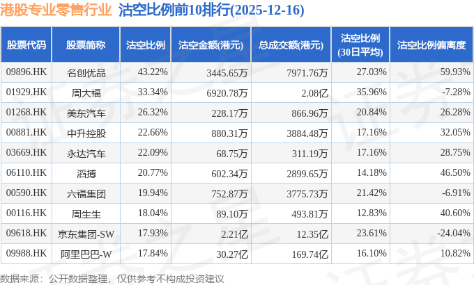 从沽空比例来看,名创优品、周大福、美东汽车沽空比例位居行业前三,分别为43.22%、33.34%、26.32%。