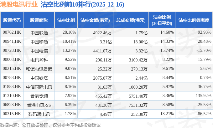 从沽空比例偏离度来看,香港宽频、中国联通、中信国际电讯沽空比例偏离度位居行业前三,分别为135.92%、92.93%、36.75%。