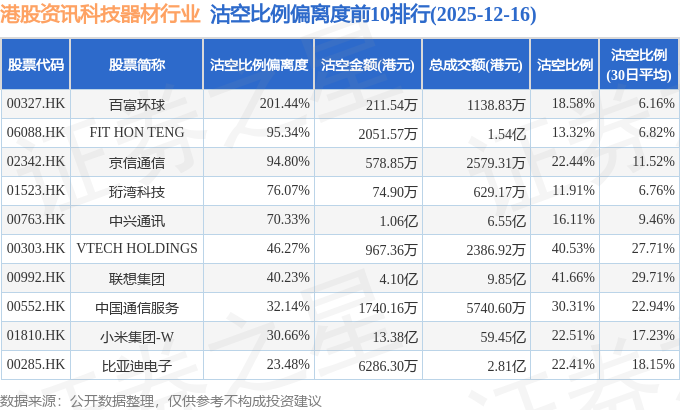 从沽空比例偏离度来看,百富环球、FIT HON TENG、京信通信沽空比例偏离度位居行业前三,分别为201.44%、95.34%、94.8%。