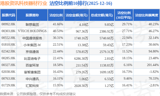 从沽空比例来看,联想集团、VTECH HOLDINGS、中国通信服务沽空比例位居行业前三,分别为41.66%、40.53%、30.31%。