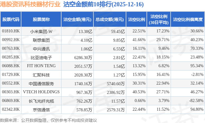 从沽空金额来看,小米集团-W、联想集团、中兴通讯沽空金额位居行业前三,分别为13.38亿港元、4.1亿港元、1.06亿港元。