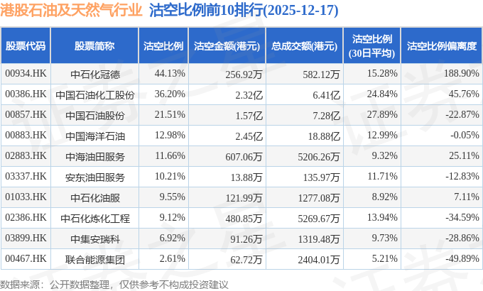 从沽空比例偏离度来看,中石化冠德、中国石油化工股份、中海油田服务沽空比例偏离度位居行业前三,分别为188.9%、45.76%、25.11%。