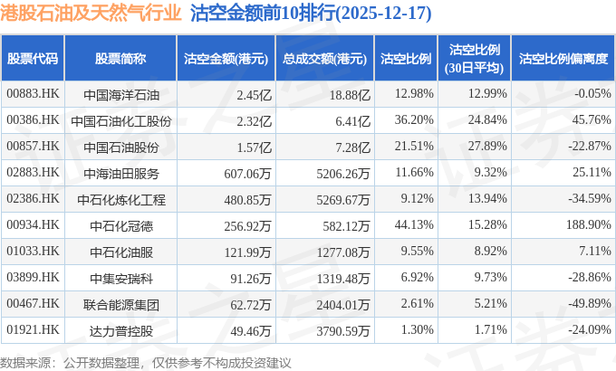 从沽空金额来看,中国海洋石油、中国石油化工股份、中国石油股份沽空金额位居行业前三,分别为2.45亿港元、2.32亿港元、1.57亿港元。