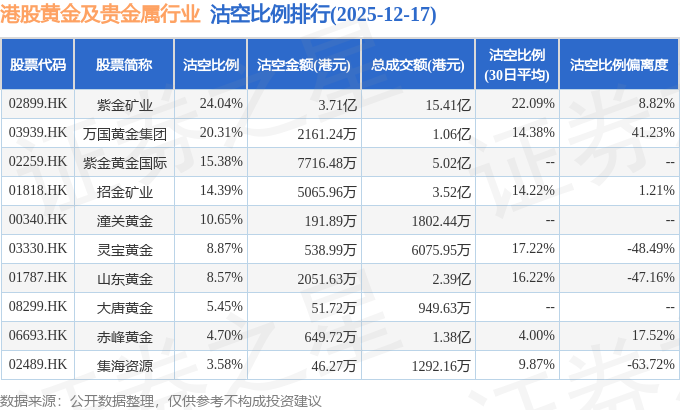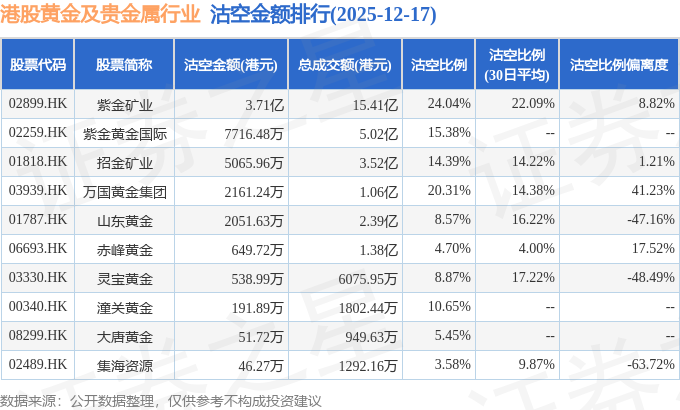 从沽空比例来看,紫金矿业、万国黄金集团、紫金黄金国际沽空比例位居行业前三,分别为24.04%、20.31%、15.38%。