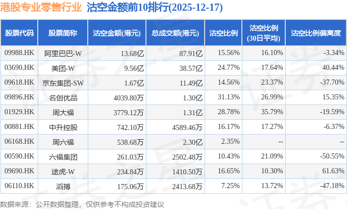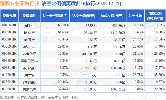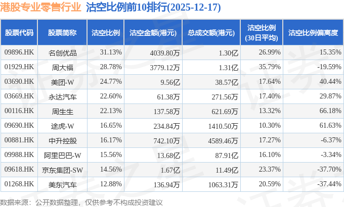 从沽空比例来看,名创优品、周大福、美团-W沽空比例位居行业前三,分别为31.13%、28.78%、24.77%。