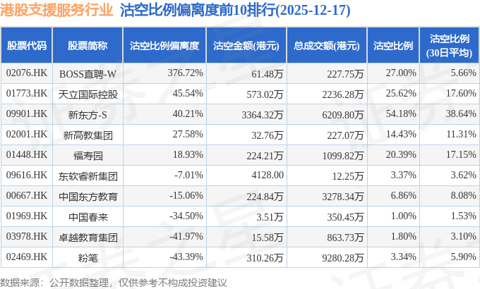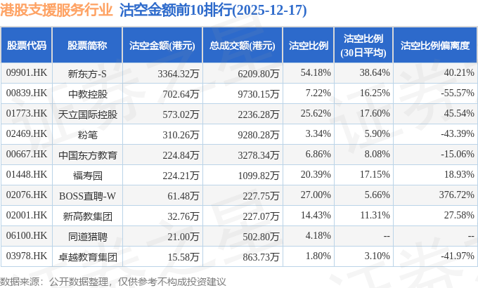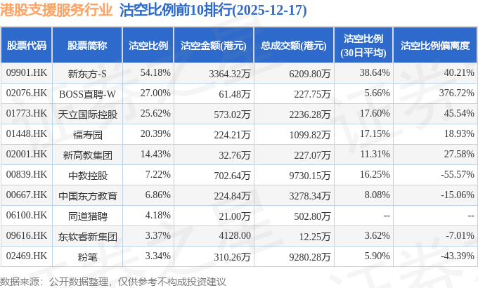 从沽空比例来看,新东方-S、BOSS直聘-W、天立国际控股沽空比例位居行业前三,分别为54.18%、27%、25.62%。