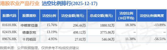 证券之星消息,12月17日港交所披露数据显示,当日港股农业产品行业的21只个股中有3只被沽空,总沽空股数为203.02万股,总沽空金额为821.58万元(港元),而当日农业产品行业的总成交金额为7413.4万元(港元),沽空比例为11.08%。当日农业产品行业总体涨0.73%。