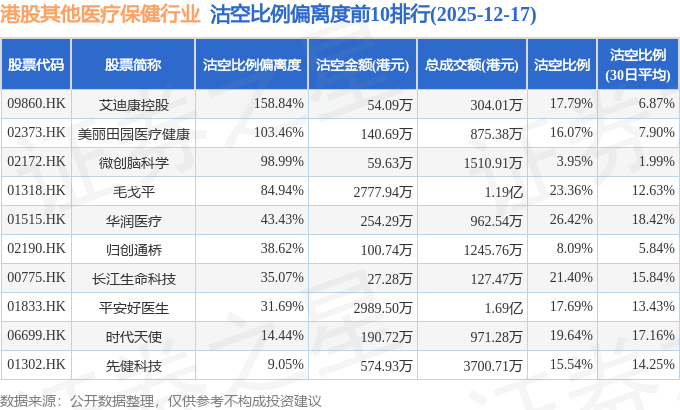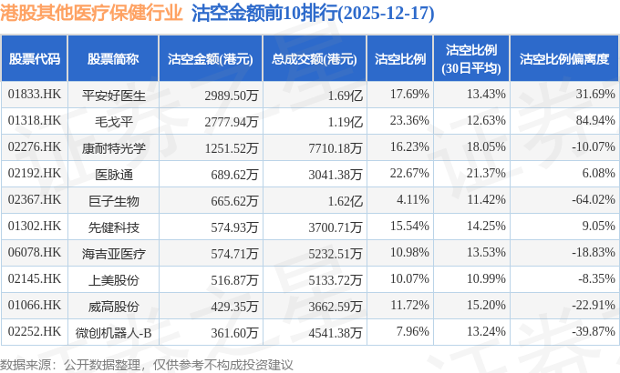 从沽空金额来看,平安好医生、毛戈平、康耐特光学沽空金额位居行业前三,分别为2989.5万港元、2777.94万港元、1251.52万港元。