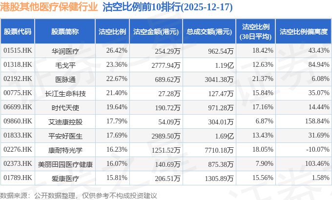 从沽空比例来看,华润医疗、毛戈平、医脉通沽空比例位居行业前三,分别为26.42%、23.36%、22.67%。