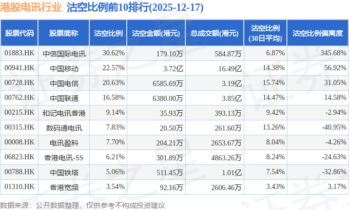 从沽空比例偏离度来看,中信国际电讯、中国移动、中国电信沽空比例偏离度位居行业前三,分别为345.68%、56.92%、31.05%。