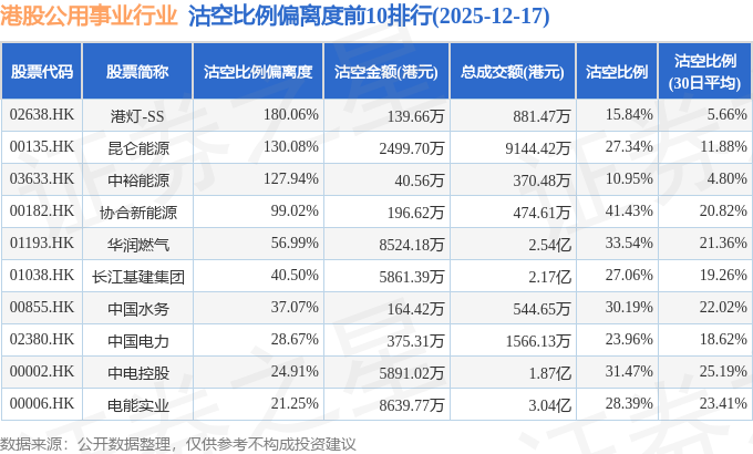 从沽空比例偏离度来看,港灯-SS、昆仑能源、中裕能源沽空比例偏离度位居行业前三,分别为180.06%、130.08%、127.94%。
