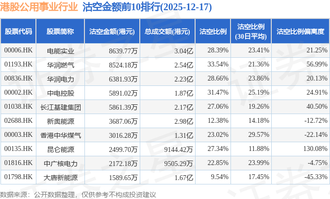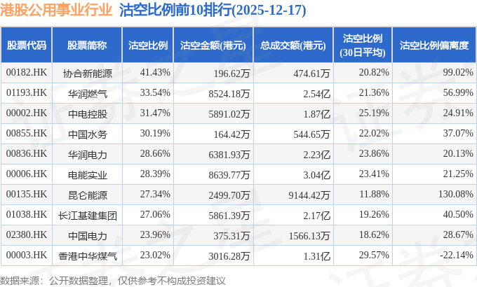 从沽空比例来看,协合新能源、华润燃气、中电控股沽空比例位居行业前三,分别为41.43%、33.54%、31.47%。