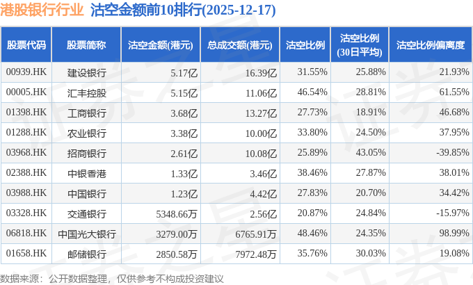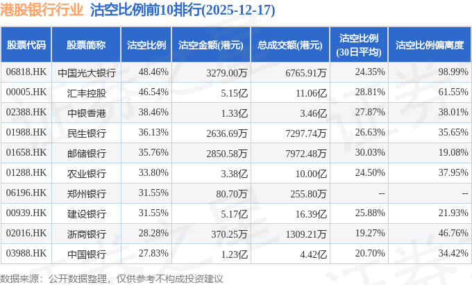 从沽空比例来看,中国光大银行、汇丰控股、中银香港沽空比例位居行业前三,分别为48.46%、46.54%、38.46%。