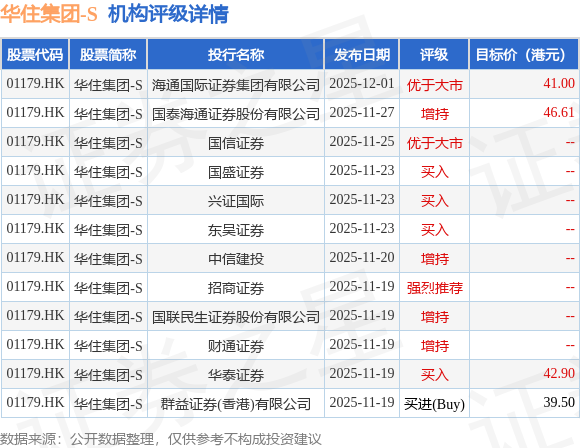 投行对该股的评级以增持为主,近90天内共有4家投行给出增持评级,近90天的目标均价为42.5港元。海通国际证券集团有限公司最新一份研报给予华住集团-S优于大市评级,目标价41港元。