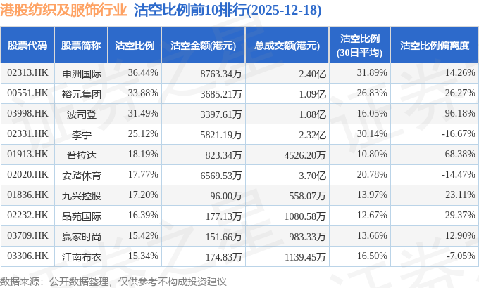 从沽空比例来看,申洲国际、裕元集团、波司登沽空比例位居行业前三,分别为36.44%、33.88%、31.49%。