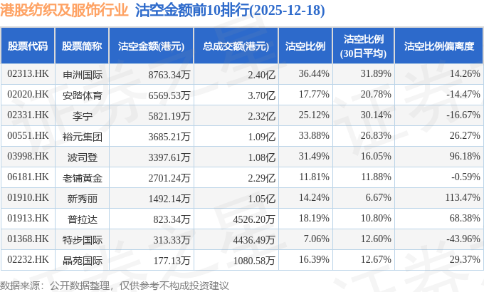 从沽空金额来看,申洲国际、安踏体育、李宁沽空金额位居行业前三,分别为8763.34万港元、6569.53万港元、5821.19万港元。