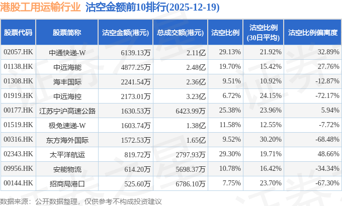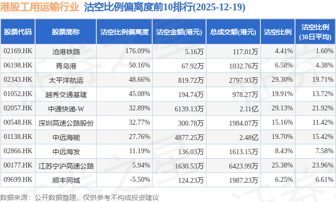 从沽空金额来看,中通快递-W、中远海能、海丰国际沽空金额位居行业前三,分别为6139.13万港元、4877.25万港元、2241.54万港元。