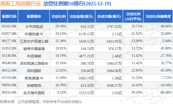 从沽空比例来看,太平洋航运、中通快递-W、江苏宁沪高速公路沽空比例位居行业前三,分别为29.3%、29.13%、25.38%。