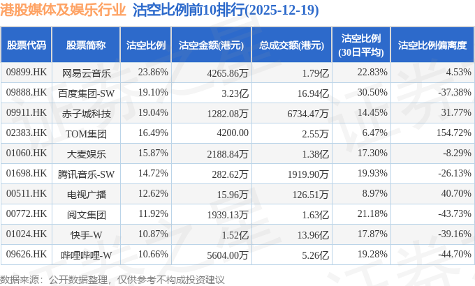 从沽空比例来看,网易云音乐、百度集团-SW、赤子城科技沽空比例位居行业前三,分别为23.86%、19.1%、19.04%。