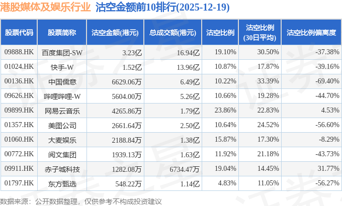 从沽空金额来看,百度集团-SW、快手-W、中国儒意沽空金额位居行业前三,分别为3.23亿港元、1.52亿港元、6629.06万港元。