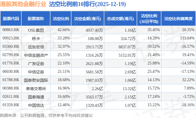 从沽空比例来看,OSL集团、移卡、远东宏信沽空比例位居行业前三,分别为42.66%、33.28%、32.97%。