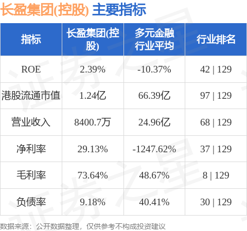 长盈集团(控股)港股市值1.24亿港元,在多元金融行业中排名第97。主要指标见下表: