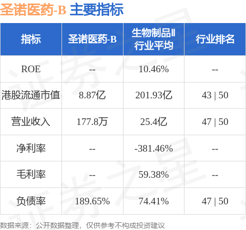 圣诺医药-B港股市值8.87亿港元,在生物制品Ⅱ行业中排名第43。主要指标见下表: