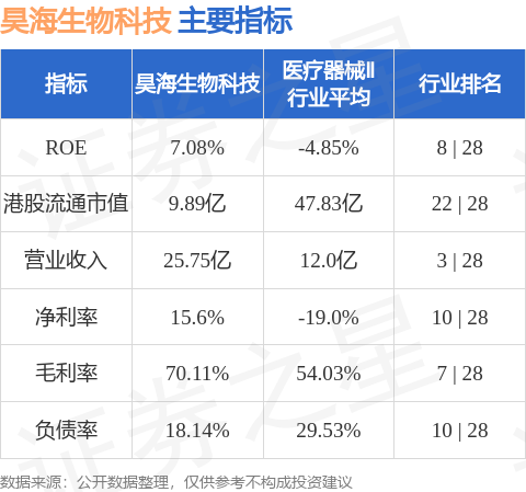昊海生物科技港股市值9.89亿港元,在医疗器械Ⅱ行业中排名第22。主要指标见下表: