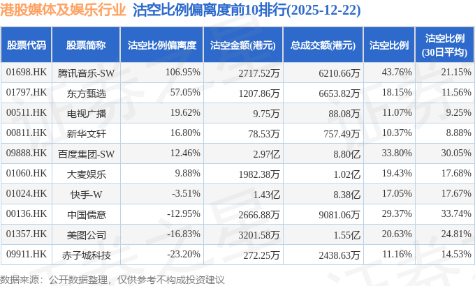 从沽空比例偏离度来看,腾讯音乐-SW、东方甄选、电视广播沽空比例偏离度位居行业前三,分别为106.95%、57.05%、19.62%。