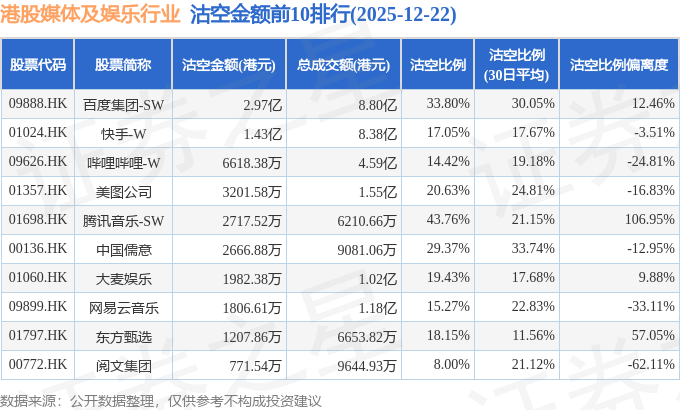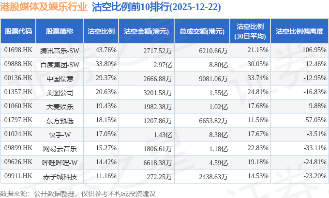 从沽空比例来看,腾讯音乐-SW、百度集团-SW、中国儒意沽空比例位居行业前三,分别为43.76%、33.8%、29.37%。