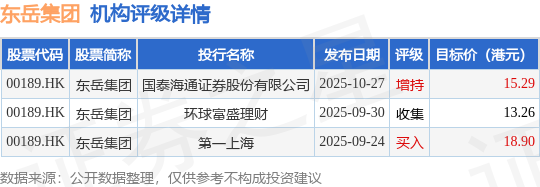 投行对该股的评级以收集为主,近90天内共有1家投行给出收集评级,近90天的目标均价为15.82港元。国泰海通证券股份有限公司最新一份研报给予东岳集团增持评级,目标价15.29港元。