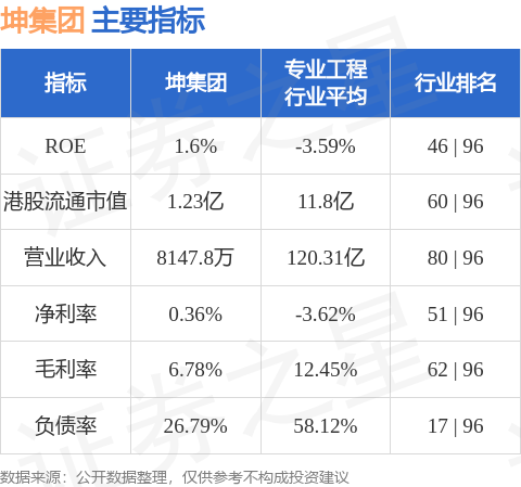 坤集团港股市值1.23亿港元,在专业工程行业中排名第60。主要指标见下表: