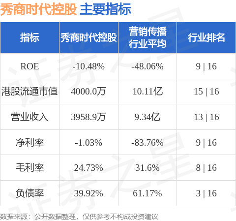 秀商时代控股港股市值4000万港元,在营销传播行业中排名第15。主要指标见下表: