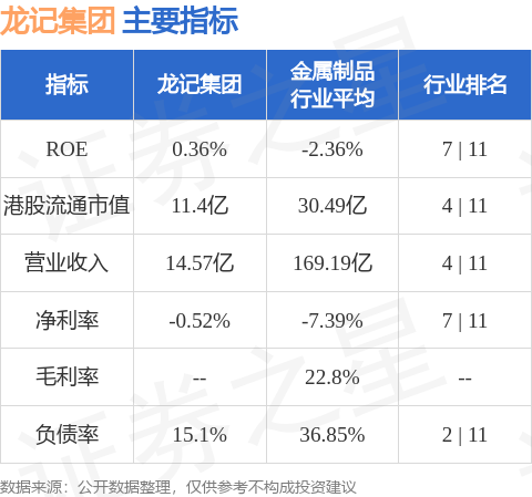 龙记集团港股市值11.4亿港元,在金属制品行业中排名第4。主要指标见下表: