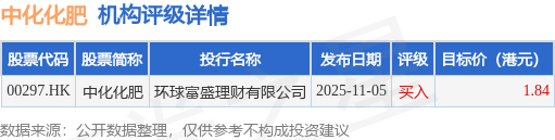 截至2025年12月23日收盘,中化化肥(00297.HK)报收于1.53港元,与上一交易日持平,成交量1054.89万股,成交额1615.88万港元。投行对该股的评级以买入为主,近90天内共有1家投行给出买入评级,近90天的目标均价为1.84港元。环球富盛理财有限公司最新一份研报给予中化化肥买入评级,目标价1.84港元。