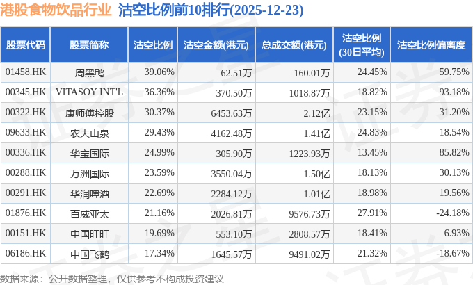 从沽空比例来看,周黑鸭、VITASOY INT'L、康师傅控股沽空比例位居行业前三,分别为39.06%、36.36%、30.37%。