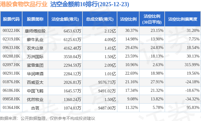 从沽空金额来看,康师傅控股、蒙牛乳业、农夫山泉沽空金额位居行业前三,分别为6453.63万港元、6125.61万港元、4162.48万港元。
