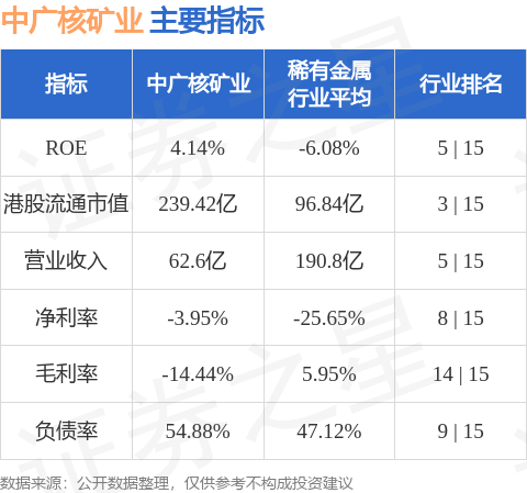 中广核矿业港股市值239.42亿港元,在稀有金属行业中排名第3。主要指标见下表: