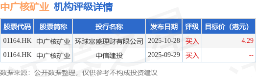 投行对该股的评级以买入为主,近90天内共有2家投行给出买入评级,近90天的目标均价为4.29港元。环球富盛理财有限公司最新一份研报给予中广核矿业买入评级,目标价4.29港元。