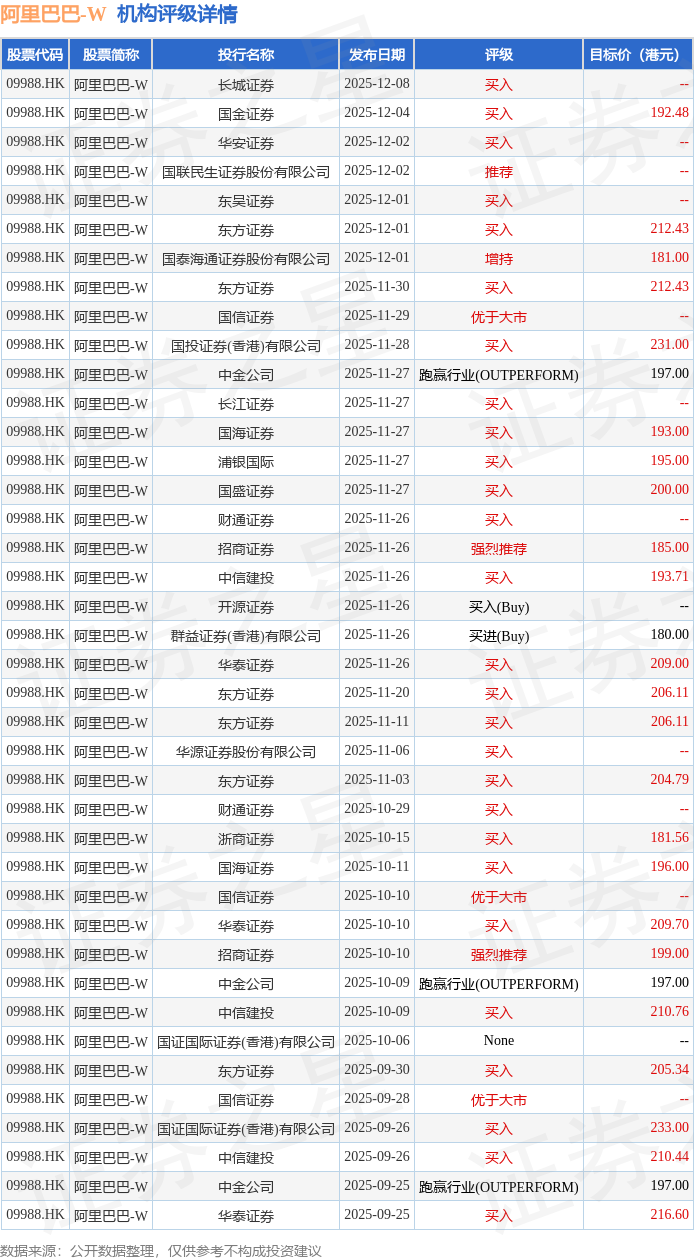 截至2025年12月24日收盘,阿里巴巴-W(09988.HK)报收于146.0港元,下跌0.82%,成交量2896.77万股,成交额42.35亿港元。投行对该股的评级以买入为主,近90天内共有27家投行给出买入评级,近90天的目标均价为202.05港元。长城证券最新一份研报给予阿里巴巴-W买入评级。