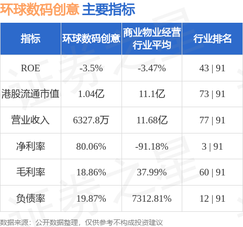 环球数码创意港股市值1.04亿港元,在商业物业经营行业中排名第73。主要指标见下表: