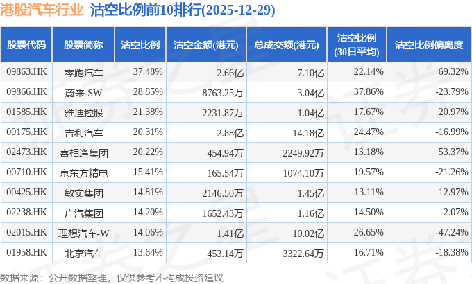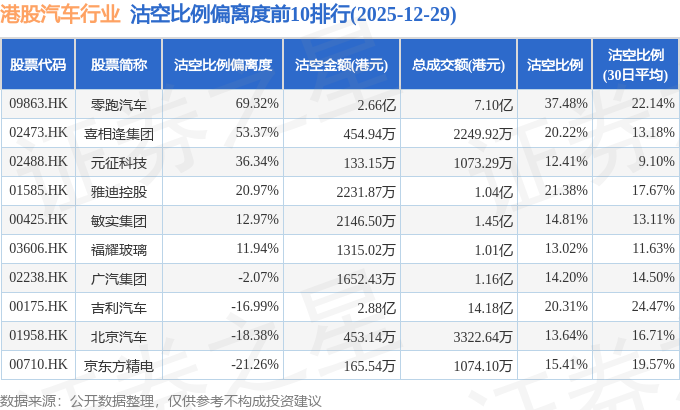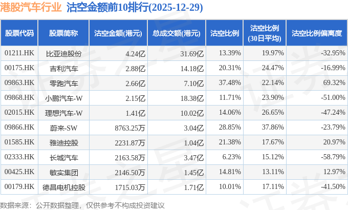 从沽空金额来看,比亚迪股份、吉利汽车、零跑汽车沽空金额位居行业前三,分别为4.24亿港元、2.88亿港元、2.66亿港元。