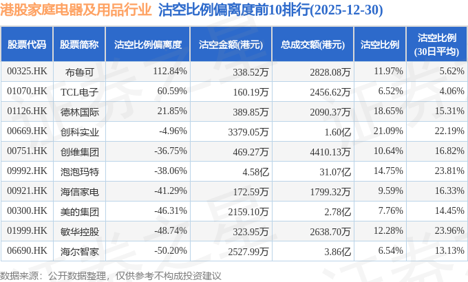 从沽空比例偏离度来看,布鲁可、TCL电子、德林国际沽空比例偏离度位居行业前三,分别为112.84%、60.59%、21.85%。